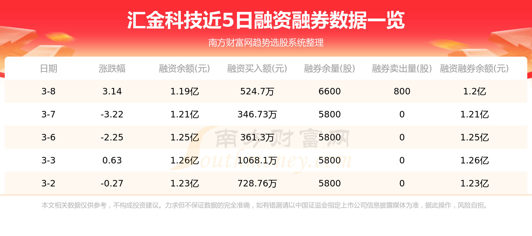 3月8日汇金科技融券信息显示,融资方面,当日融资买入524.7万元,融资偿还634.45万元,融资净买额-109.75万元。