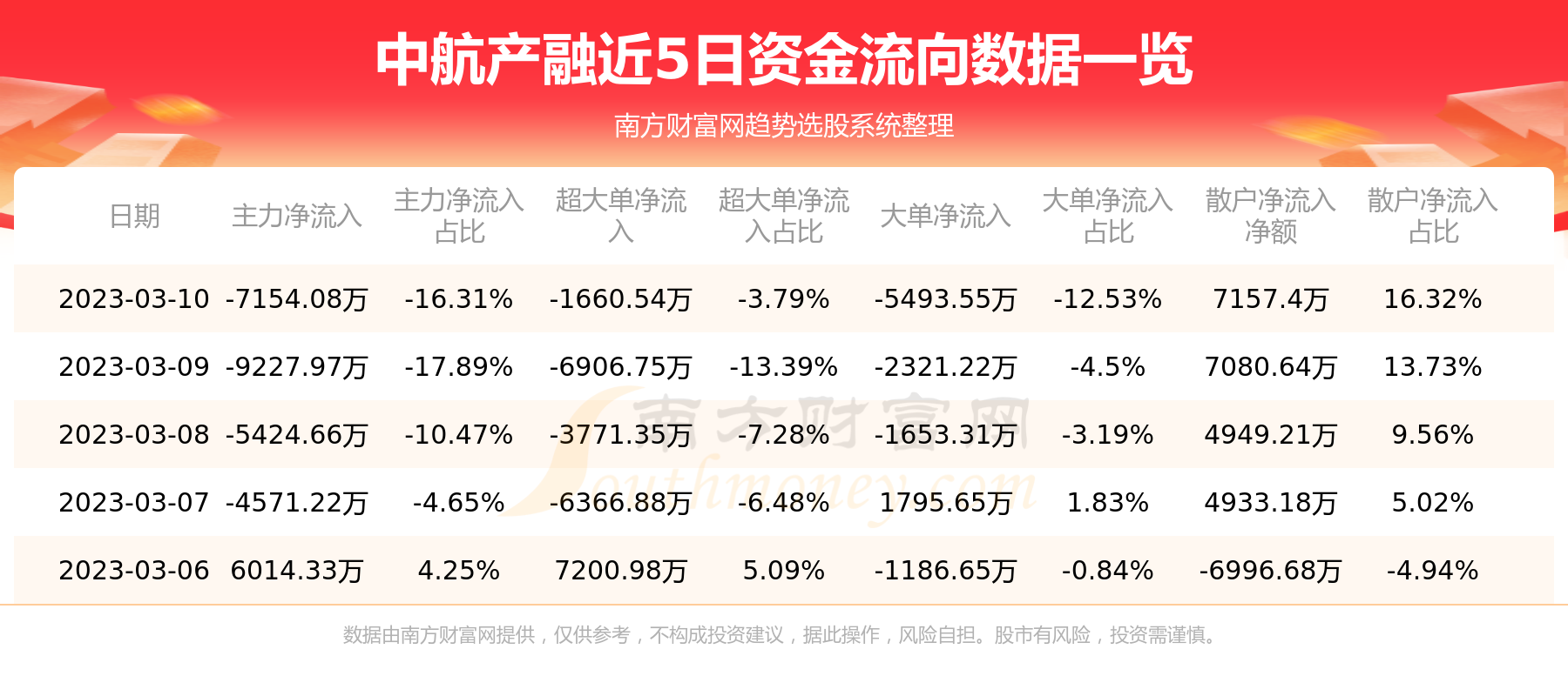 3月10日消息,中航产融3月10日主力净流出7154.08万元,超大单净流出1660.54万元,大单净流出5493.55万元,散户净流入7157.4万元。