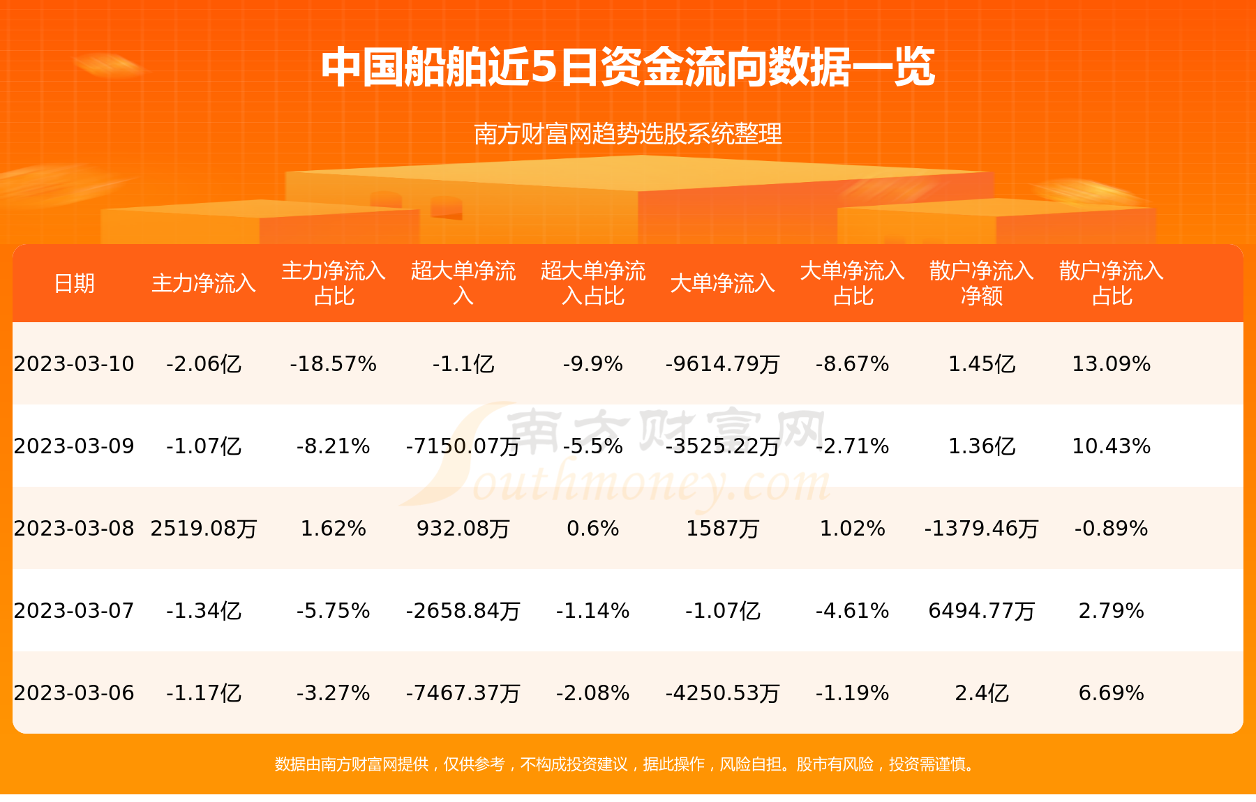 3月10日消息,中国船舶主力资金净流出2.06亿元,超大单资金净流出1.1亿元,散户资金净流入1.45亿元。