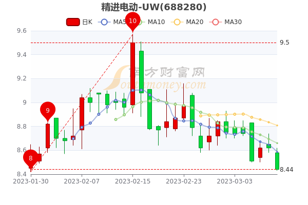 3月10日精进电动-UW3日内股价下跌2.13%,截至15时收盘,该股报8.440元跌2.09%,成交1363.9万元,换手率0.35%。