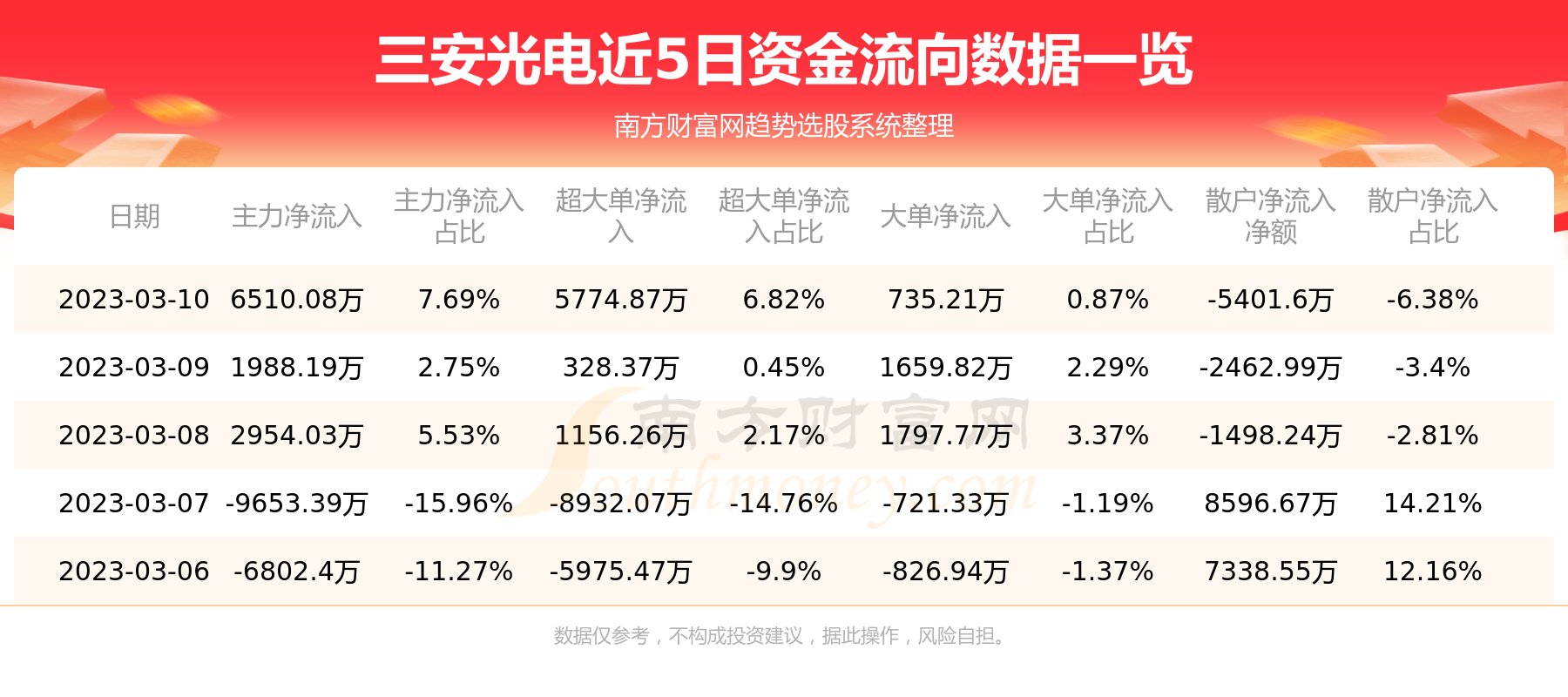 3月10日消息,三安光电主力净流入6510.08万元,超大单净流入5774.87万元,散户净流出5401.6万元。