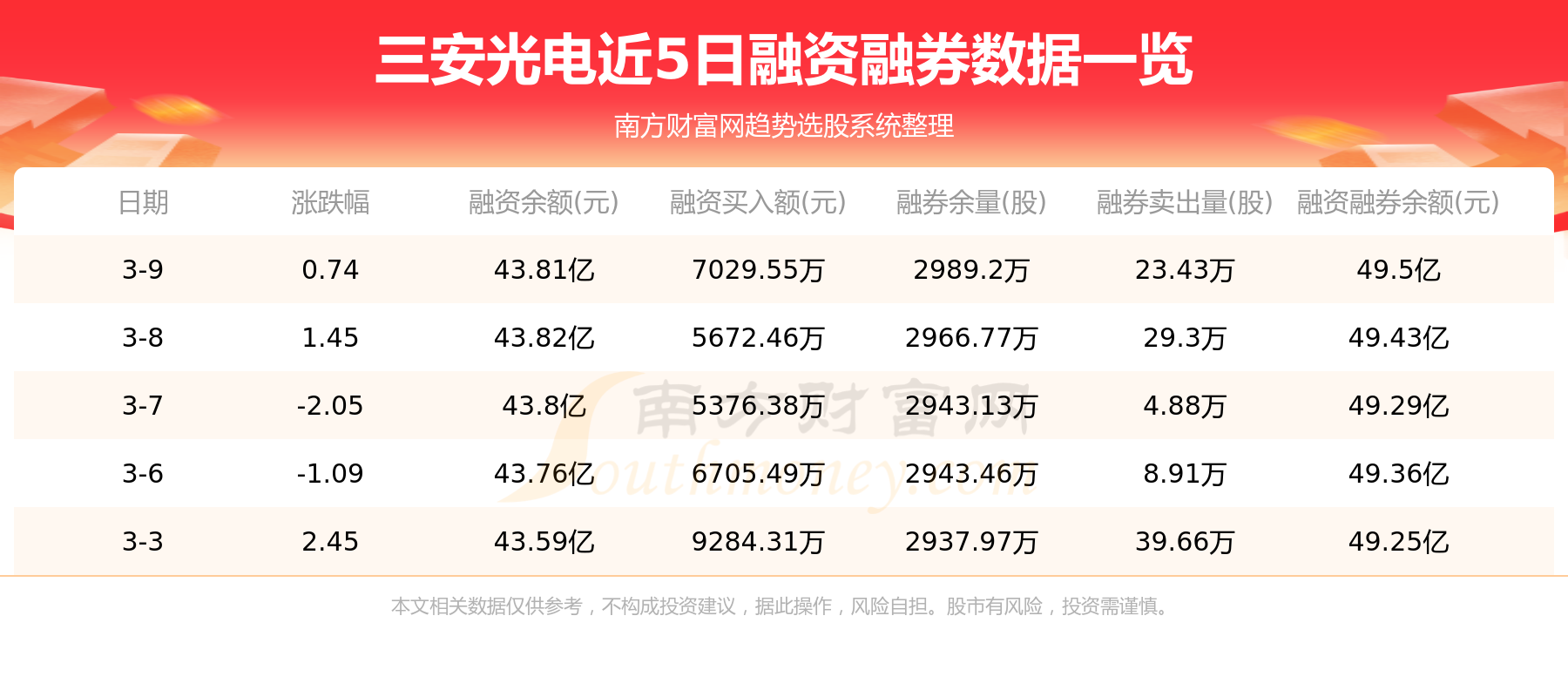 三安光电3月9日融券信息显示,融资方面,当日融资买入7029.55万元,融资偿还7179.62万元,融资净买额-150.07万元。融券方面,融券卖出23.43万股,融券偿还1万股,融券余量2989.2万股,融券余额5.69亿元。融资融券余额49.5亿元。近5日融资融券数据一览见下表: