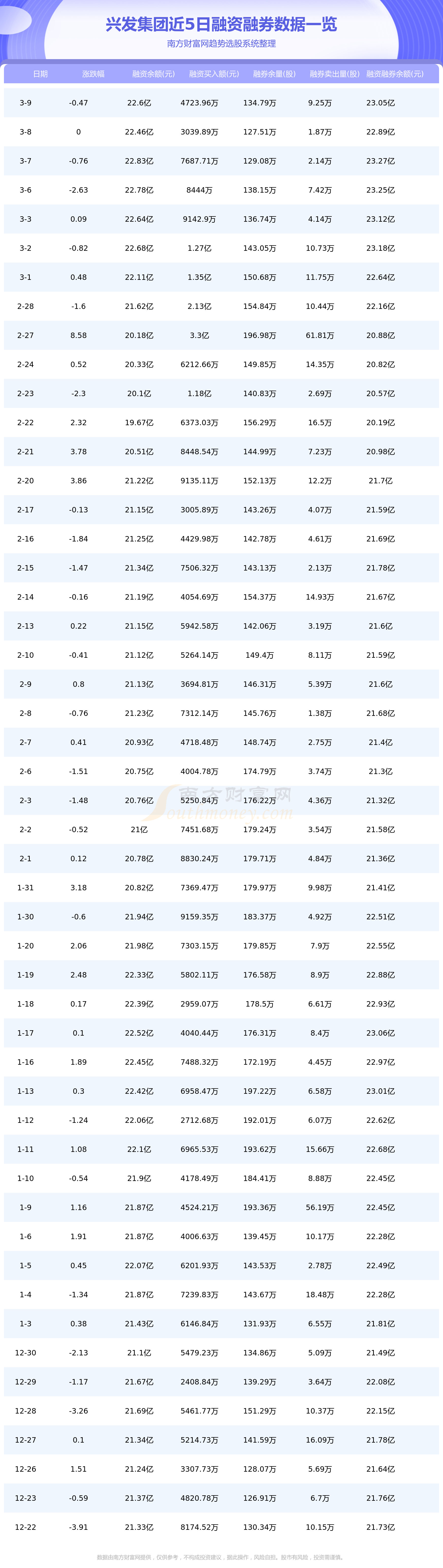 兴发集团3月9日融券信息显示,融资方面,当日融资买入4723.96万元,融资偿还3350.68万元,融资净买额1373.28万元。融券方面,融券卖出9.25万股,融券偿还1.97万股,融券余量134.79万股,融券余额4538.39万元。融资融券余额23.05亿元。近5日融资融券数据一览见下表:
