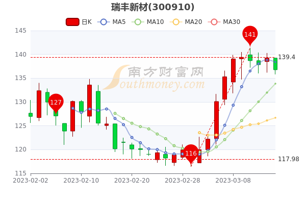3月15日盘后消息,瑞丰新材5日内股价下跌1.92%,截至15点收盘,该股报136.770元,跌1.21%,总市值为205.16亿元。