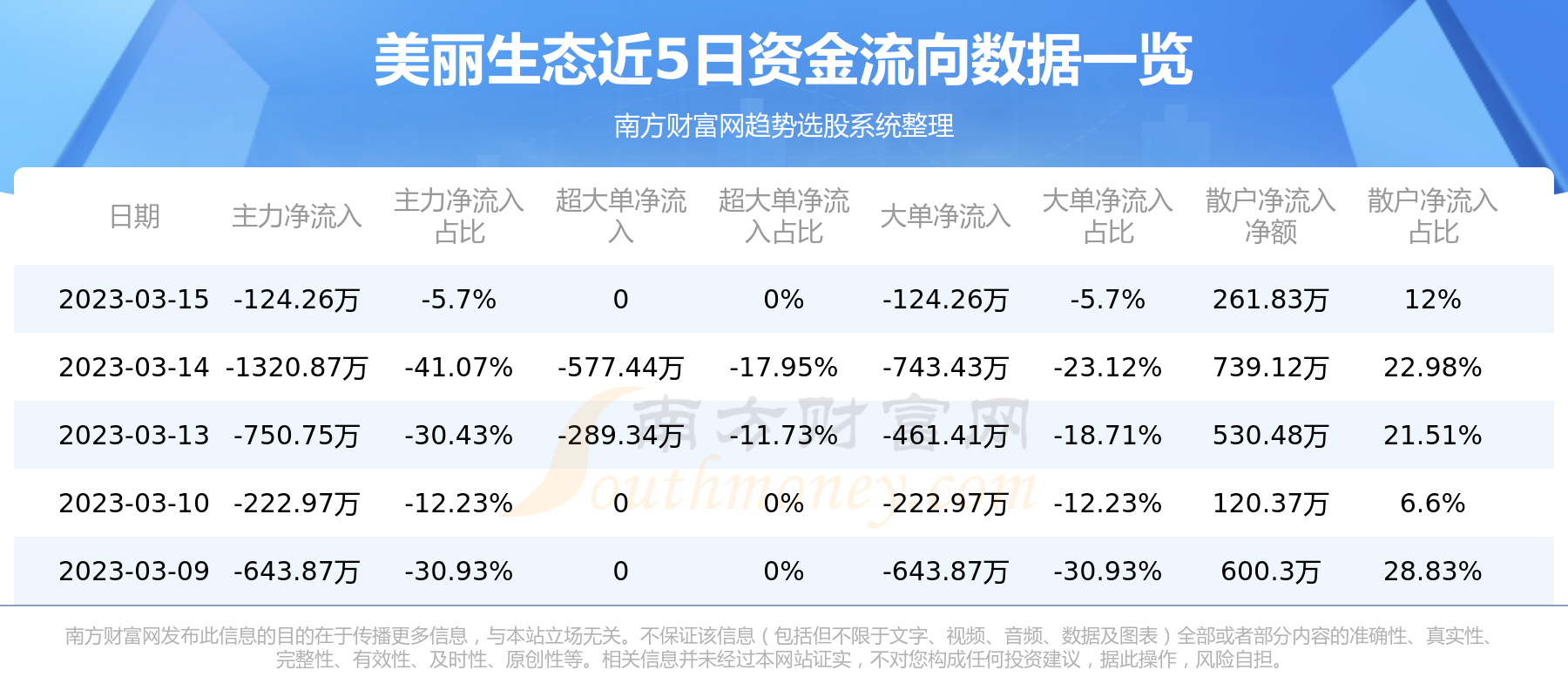3月15日消息,美丽生态资金净流出124.26万元,换手率1.3%,成交金额2181.9万元。