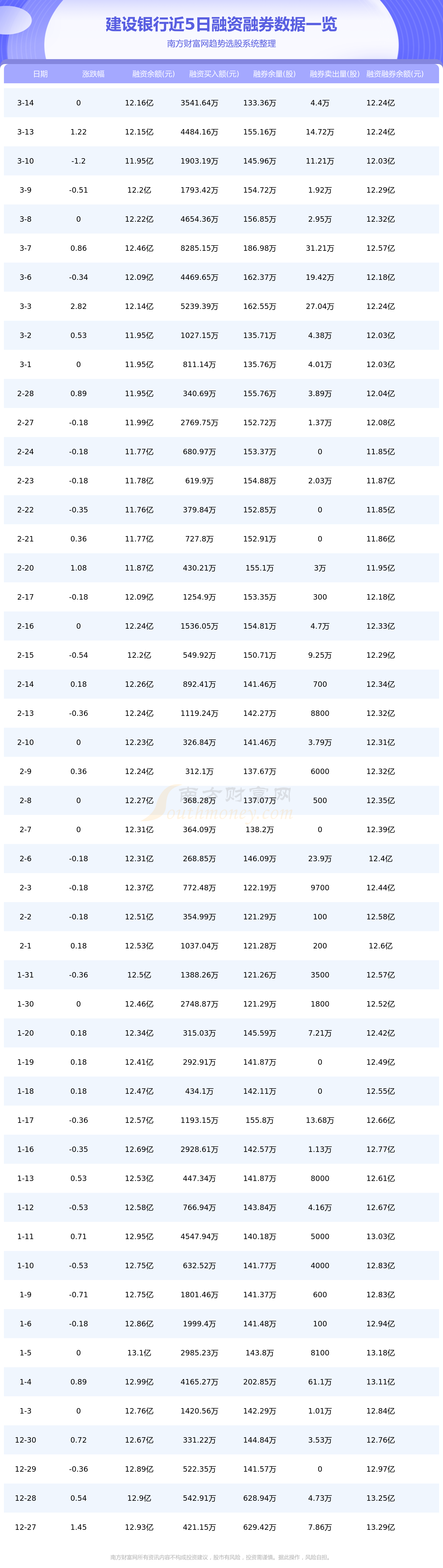 3月14日建设银行融券信息显示,融资方面,当日融资买入3541.64万元,融资偿还3437.14万元,融资净买额104.5万元。融券方面,融券卖出4.4万股,融券偿还26.2万股,融券余量133.36万股,融券余额777.49万元。融资融券余额12.24亿元。近5日融资融券数据一览见下表: