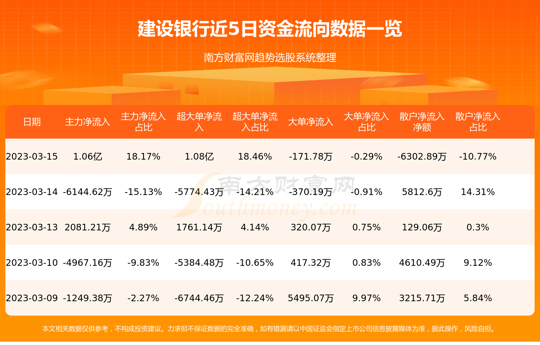 3月15日消息,建设银行资金净流入1.06亿元,超大单资金净流入1.08亿元,换手率1.03%,成交金额5.85亿元。