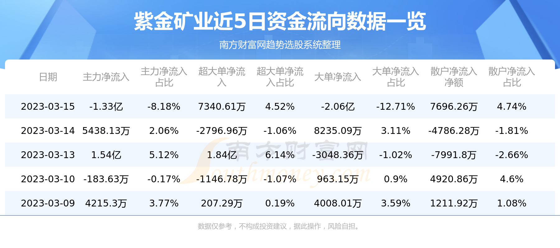 以上内容就是对【湖南期货配资 紫金矿业3月15日主力资金净流出1.33亿元】的解答,如果解决了您的问题欢迎把链接分享给朋友(https://www.youge168.com/mod_article-article_content-article_id-47654.html)