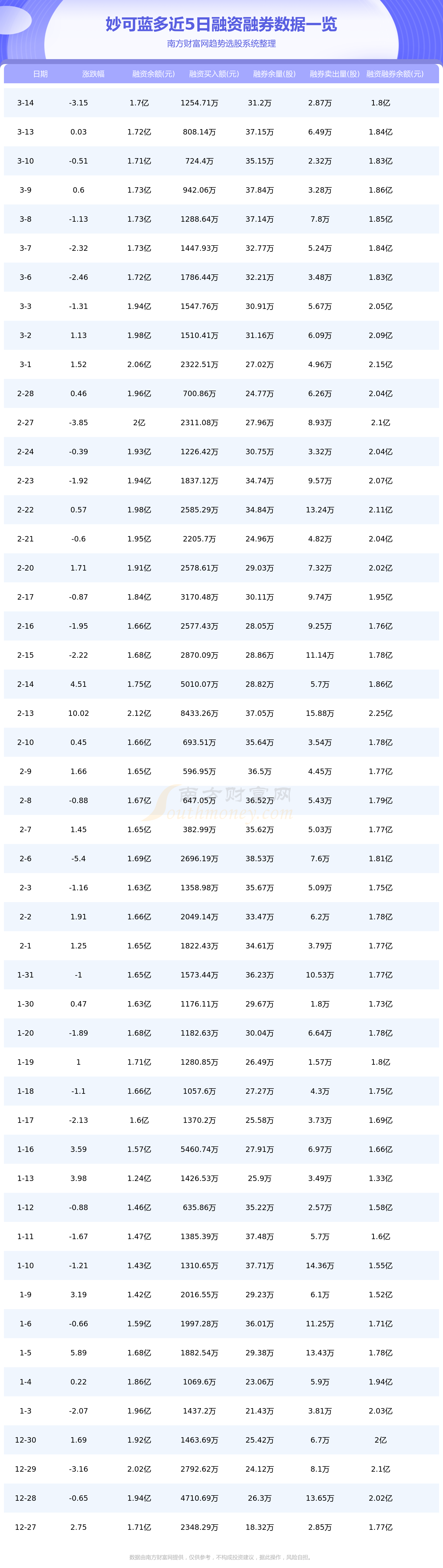 3月14日妙可蓝多融券信息显示,融资方面,当日融资买入1254.71万元,融资偿还1407.27万元,融资净买额-152.56万元。融券方面,融券卖出2.87万股,融券偿还8.82万股,融券余量31.2万股,融券余额1006.63万元。融资融券余额1.8亿元。近5日融资融券数据一览见下表: