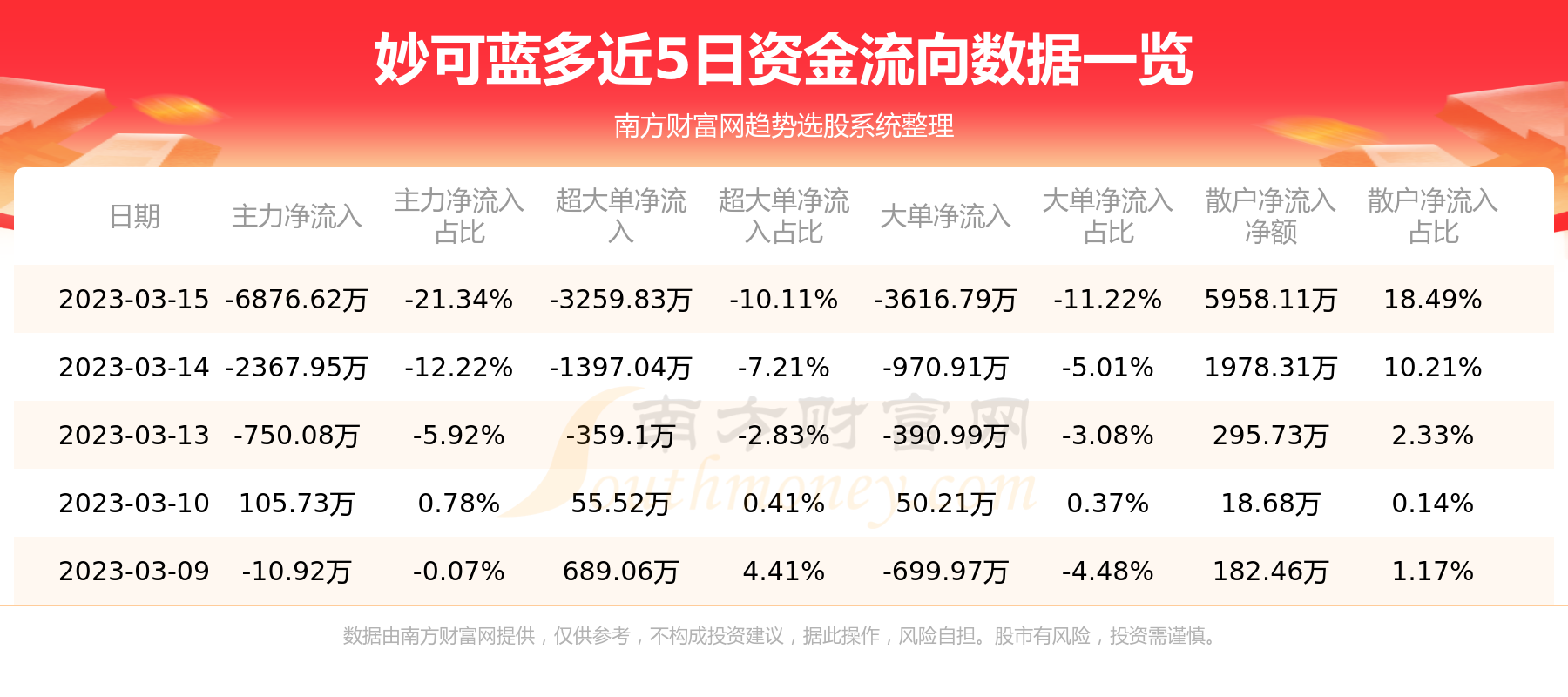 3月15日该股主力净流出6876.62万元,超大单净流出3259.83万元,大单净流出3616.79万元,中单净流入918.51万元,散户净流入5958.11万元。