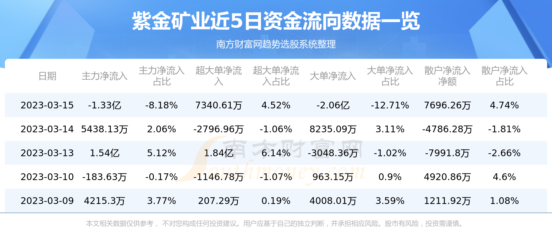 3月15日消息,紫金矿业资金净流出1.33亿元,超大单资金净流入7340.61万元,换手率0.66%,成交金额16.23亿元。