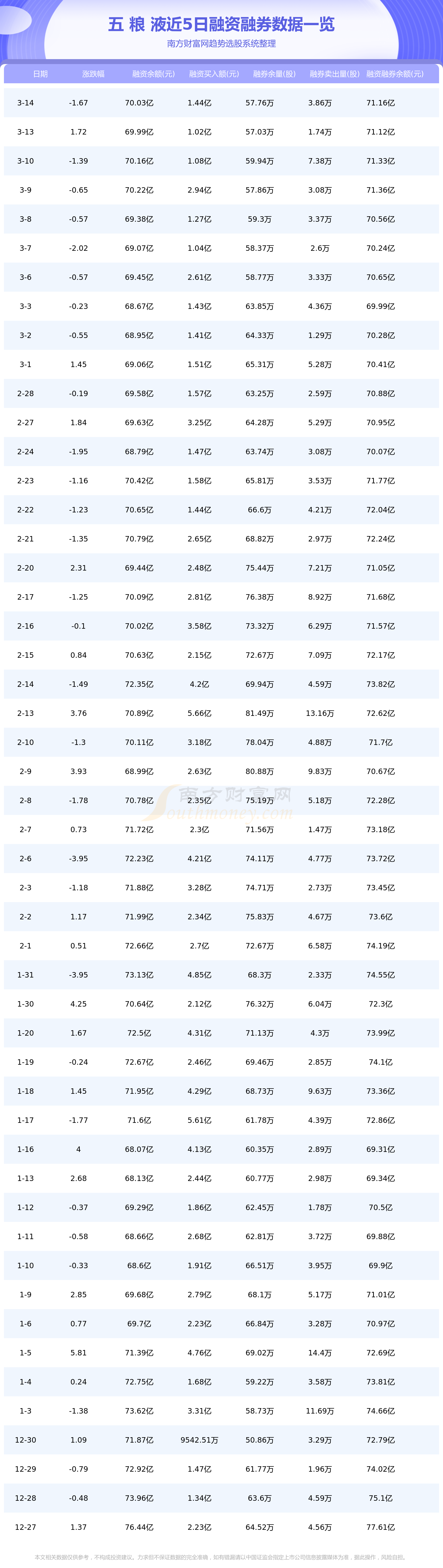 3月14日五 粮 液融券信息显示,融资方面,当日融资买入1.44亿元,融资偿还1.4亿元,融资净买额448.38万元。融券方面,融券卖出3.86万股,融券偿还3.13万股,融券余量57.76万股,融券余额1.13亿元。融资融券余额71.16亿元。近5日融资融券数据一览见下表: