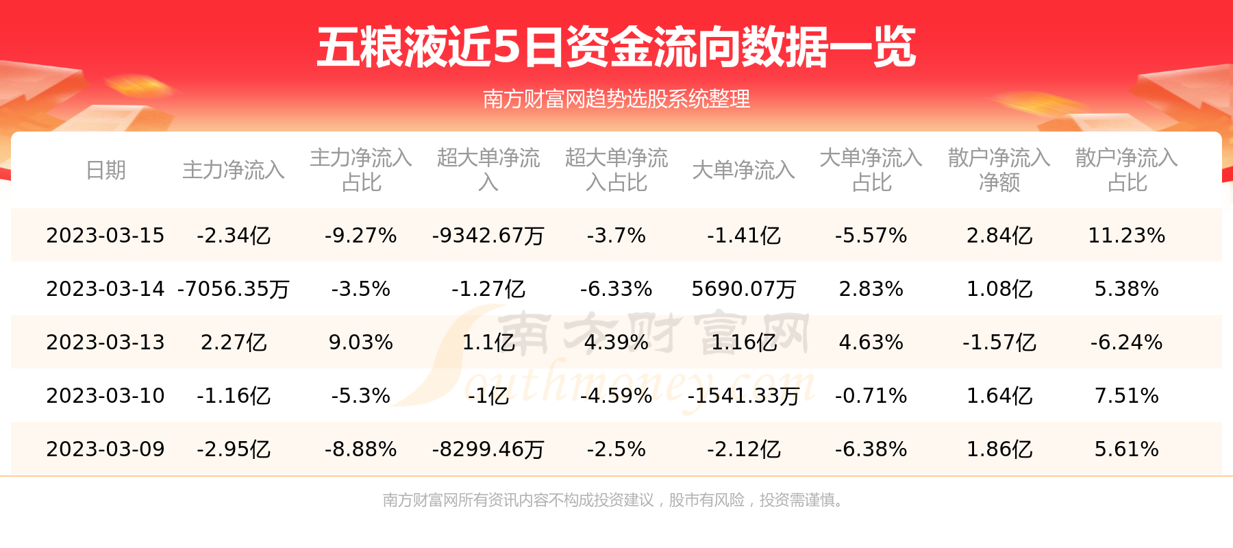 3月15日消息,五粮液3月15日主力净流出2.34亿元,超大单净流出9342.67万元,大单净流出1.41亿元,散户净流入2.84亿元。