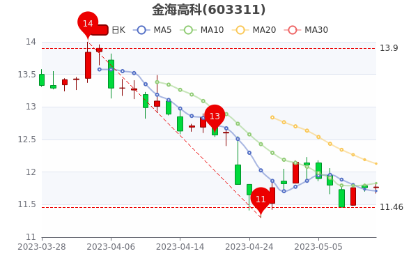 5月12日金海高科开盘报价11.76元,收盘于11.770元,涨0.09%。当日最高价为11.84元,最低达11.67元,成交量63.49万手,总市值为27.76亿元。