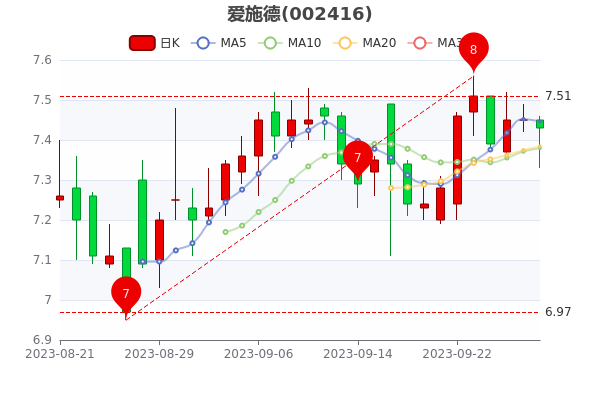 10月9日消息,爱施德最新报7.430元,跌0.27%。成交量575.84万手,总市值为92.08亿元。