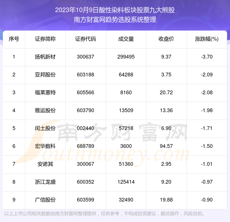 截止2023年10月9日,个股表现方面,酸性染料板块股票当日领跌股为扬帆新材(300637),该股当日报收9.37,上涨-3.70%,成交量29.95万。亚邦股份(603188)以下跌-2.09%紧随其后,该股当日成交量6.43万。此外,福莱蒽特(605566)、雅运股份(603790)、闰土股份(002440)均进入当日酸性染料板块股票熊股之列。