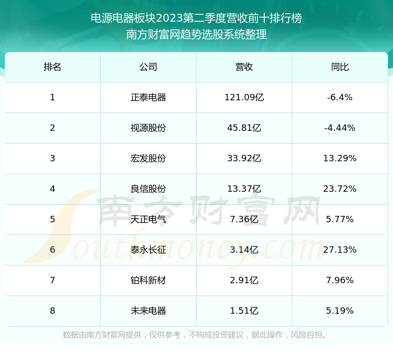 按照南方财富网趋势选股系统统计,该股所属板块为电源电器板块,该板块共有8只股票,天正电气2023第二季度营收在该板块中排名为第5名,该板块2023第二季度营收排名前十的股票如下表: