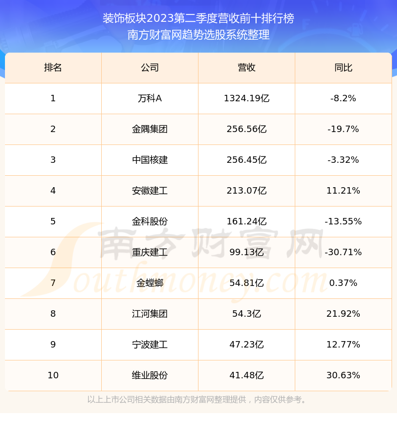 按照南方财富网趋势选股系统统计,该股所属板块为装饰板块,该板块共有57只股票,众望布艺2023第二季度营收在该板块中排名为第57名,该板块2023第二季度营收排名前十的股票如下表: