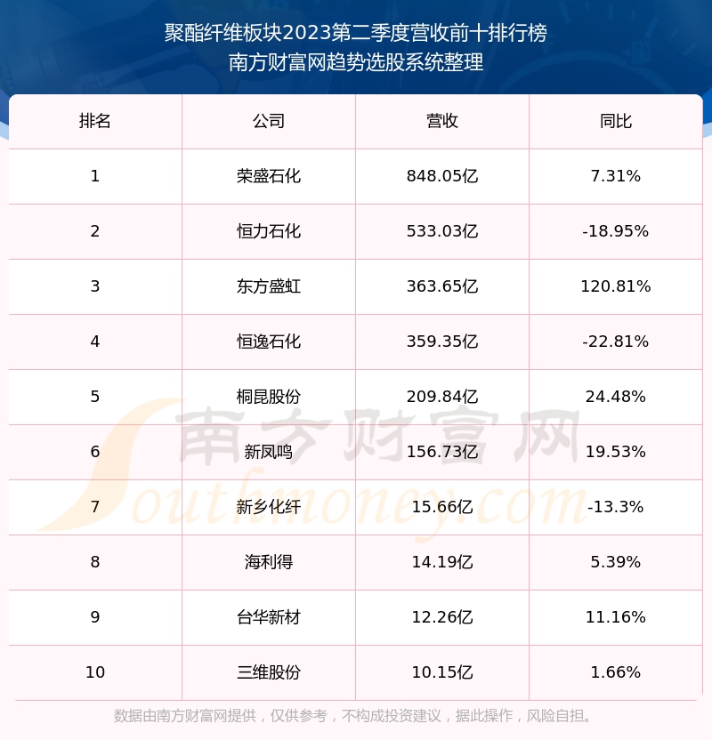 按照南方财富网趋势选股系统统计,该股所属板块为聚酯纤维板块,该板块共有17只股票,三维股份2023第二季度营收在该板块中排名为第10名,该板块2023第二季度营收排名前十的股票如下表: