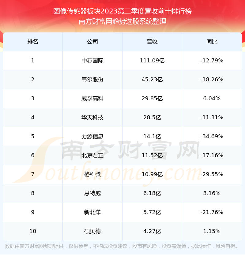 按照南方财富网趋势选股系统统计,该股所属板块为图像传感器板块,该板块共有13只股票,格科微2023第二季度营收在该板块中排名为第7名,该板块2023第二季度营收排名前十的股票如下表: