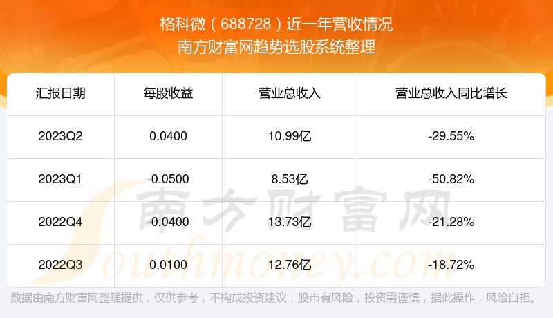 格科微发布2023年第二季度财报。实现总营收10.99亿元,同比增长-29.55%;扣非净利润同比增长-73.54%至7193.08万元。