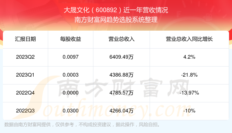 大晟文化(600892)发布2023年第二季度财报。2023年第二季度大晟文化实现营业收入6409.49万元,同比增加4.2元%,环比增加46.11%;净利润为437.82万元,同比增长-24.91%,环比增长2944.79%。