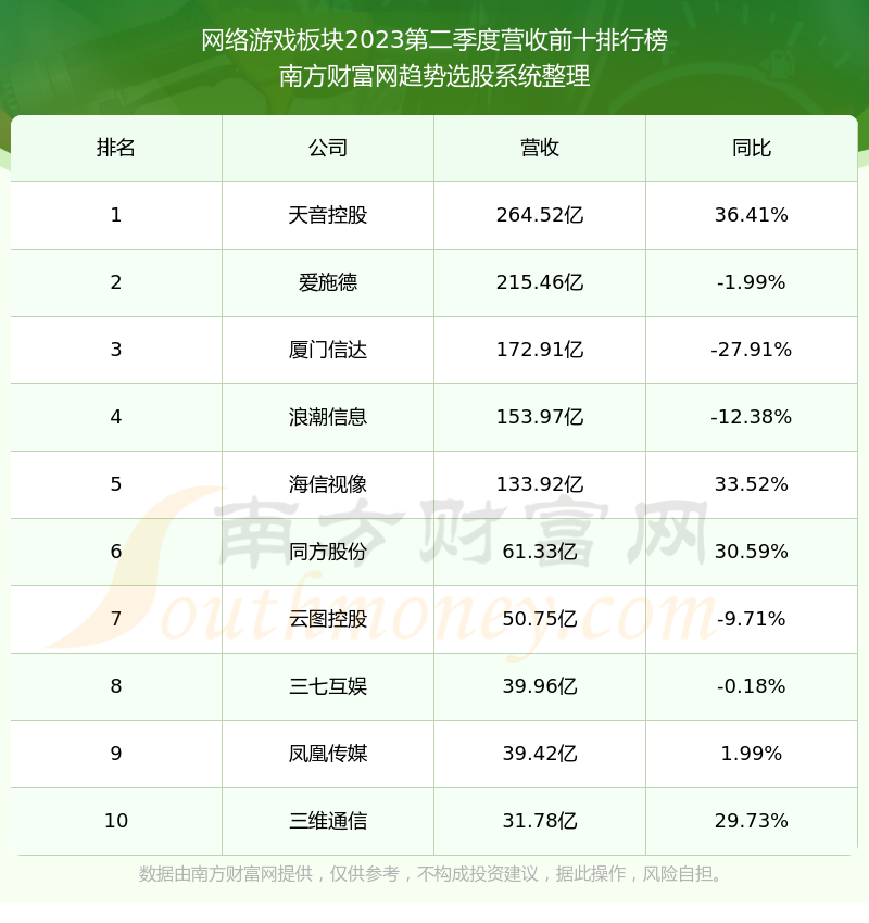 按照南方财富网趋势选股系统统计,该股所属板块为网络游戏板块,该板块共有128只股票,大晟文化2023第二季度营收在该板块中排名为第113名,该板块2023第二季度营收排名前十的股票如下表: