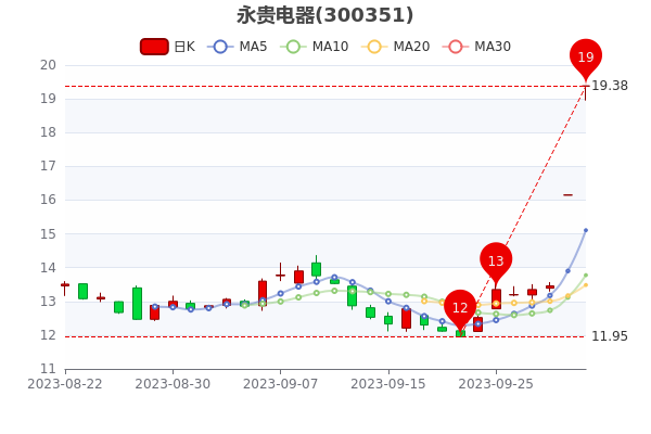 10月10日永贵电器3日内股价上涨17.34%,截至11时44分,该股报19.380元涨20%,成交8.66亿元,换手率17.32%。