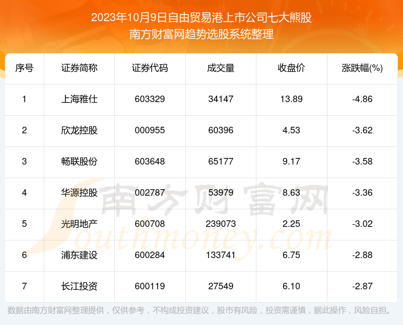 截止2023年10月9日,个股表现方面,自由贸易港上市公司当日领跌股为上海雅仕(603329),该股当日报收13.89,上涨-4.86%,成交量3.41万。欣龙控股(000955)以下跌-3.62%紧随其后,该股当日成交量6.04万。此外,畅联股份(603648)、华源控股(002787)、光明地产(600708)均进入当日自由贸易港上市公司熊股之列。
