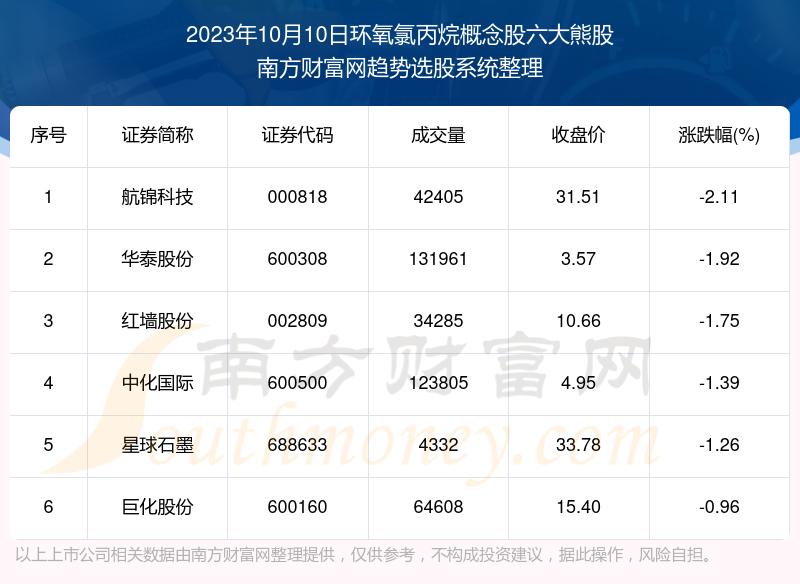 截止2023年10月10日,个股表现方面,环氧氯丙烷概念股当日领跌股为航锦科技(000818),该股当日报收31.51,上涨-2.11%,成交量4.24万。华泰股份(600308)以下跌-1.92%紧随其后,该股当日成交量13.2万。此外,红墙股份(002809)、中化国际(600500)、星球石墨(688633)均进入当日环氧氯丙烷概念股熊股之列。