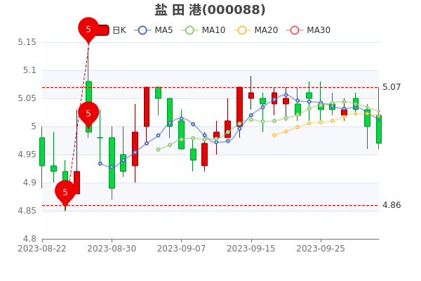 盐田港(000088)跌0.6%,报4.960元,成交额2283.86万元,换手率0.2%,振幅跌0.8%。