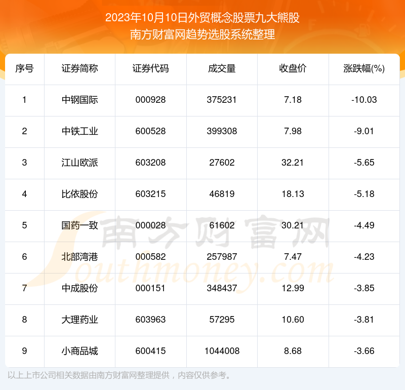 截止2023年10月10日,个股表现方面,外贸概念股票当日领跌股为中钢国际(000928),该股当日报收7.18,上涨-10.03%,成交量37.52万。中铁工业(600528)以下跌-9.01%紧随其后,该股当日成交量39.93万。此外,江山欧派(603208)、比依股份(603215)、国药一致(000028)均进入当日外贸概念股票熊股之列。