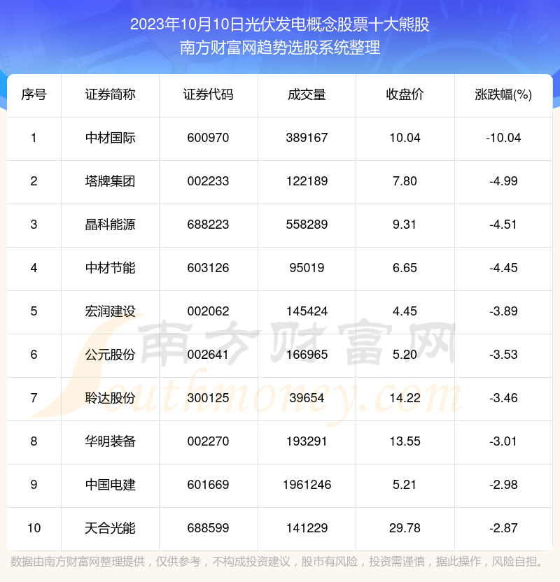 以上内容就是对【配资炒股公司 数据解盘|2023年10月10日光伏发电概念股票十大熊股一览】的解答,如果解决了您的问题欢迎把链接分享给朋友(https://www.youge168.com/mod_article-article_content-article_id-48130.html)