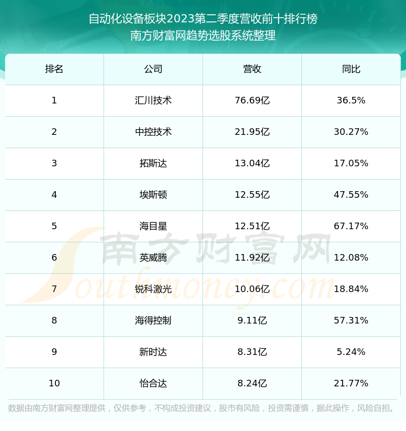 按照南方财富网趋势选股系统统计,该股所属板块为自动化设备板块,该板块共有63只股票,联赢激光2023第二季度营收在该板块中排名为第63名,该板块2023第二季度营收排名前十的股票如下表: