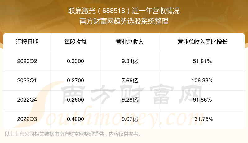 联赢激光股票近一年营收情况如下表: