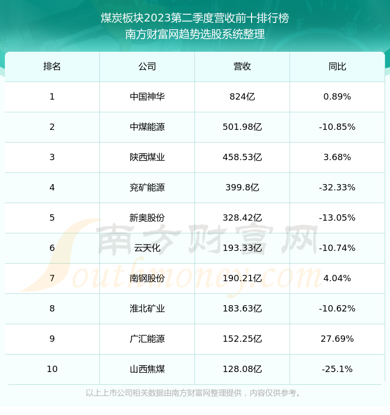 按照南方财富网趋势选股系统统计,该股所属板块为煤炭板块,该板块共有60只股票,广汇能源2023第二季度营收在该板块中排名为第9名,该板块2023第二季度营收排名前十的股票如下表: