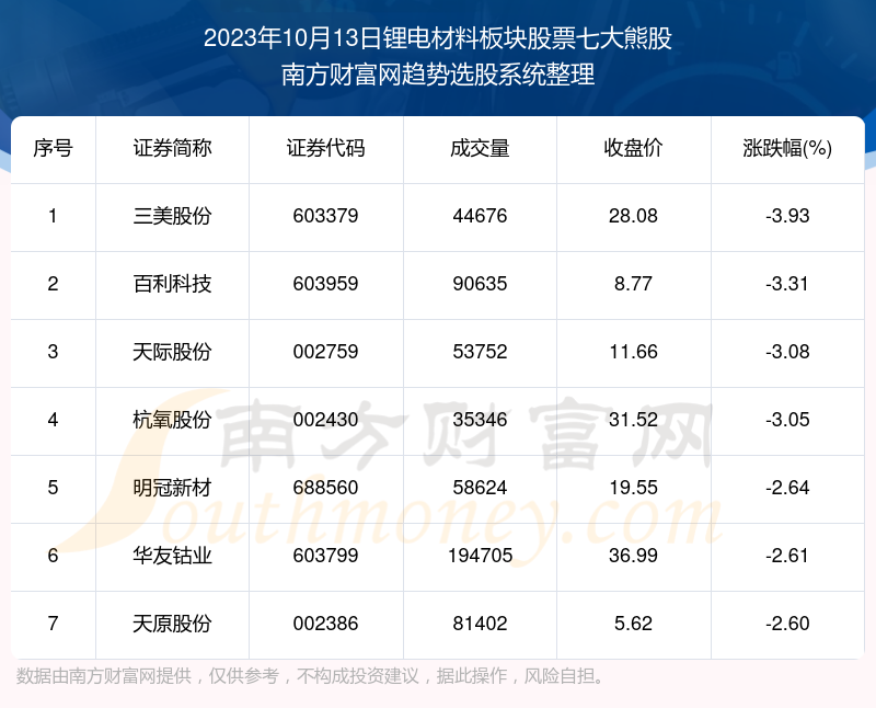 截止2023年10月13日,个股表现方面,锂电材料板块股票当日领跌股为三美股份(603379),该股当日报收28.08,上涨-3.93%,成交量4.47万。百利科技(603959)以下跌-3.31%紧随其后,该股当日成交量9.06万。此外,天际股份(002759)、杭氧股份(002430)、明冠新材(688560)均进入当日锂电材料板块股票熊股之列。