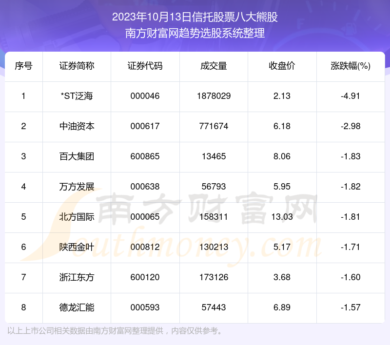 截止2023年10月13日,个股表现方面,信托股票当日领跌股为*ST泛海(000046),该股当日报收2.13,上涨-4.91%,成交量187.8万。中油资本(000617)以下跌-2.98%紧随其后,该股当日成交量77.17万。此外,百大集团(600865)、万方发展(000638)、北方国际(000065)均进入当日信托股票熊股之列。