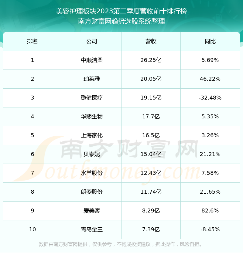 按照南方财富网趋势选股系统统计,该股所属板块为美容护理板块,该板块共有33只股票,拉芳家化2023第二季度营收在该板块中排名为第29名,该板块2023第二季度营收排名前十的股票如下表: