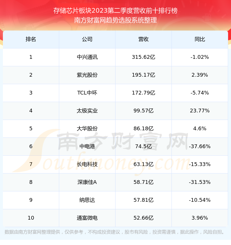 按照南方财富网趋势选股系统统计,该股所属板块为存储芯片板块,该板块共有84只股票,聚辰股份2023第二季度营收在该板块中排名为第72名,该板块2023第二季度营收排名前十的股票如下表: