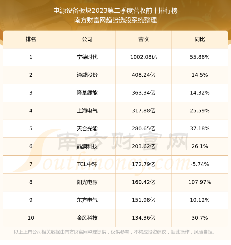 按照南方财富网趋势选股系统统计,该股所属板块为电源设备板块,该板块共有87只股票,华光环能2023第二季度营收在该板块中排名为第25名,该板块2023第二季度营收排名前十的股票如下表: