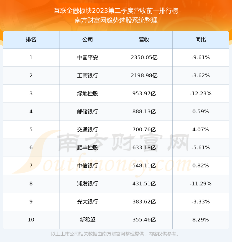 按照南方财富网趋势选股系统统计,该股所属板块为互联金融板块,该板块共有238只股票,方正证券2023第二季度营收在该板块中排名为第72名,该板块2023第二季度营收排名前十的股票如下表: