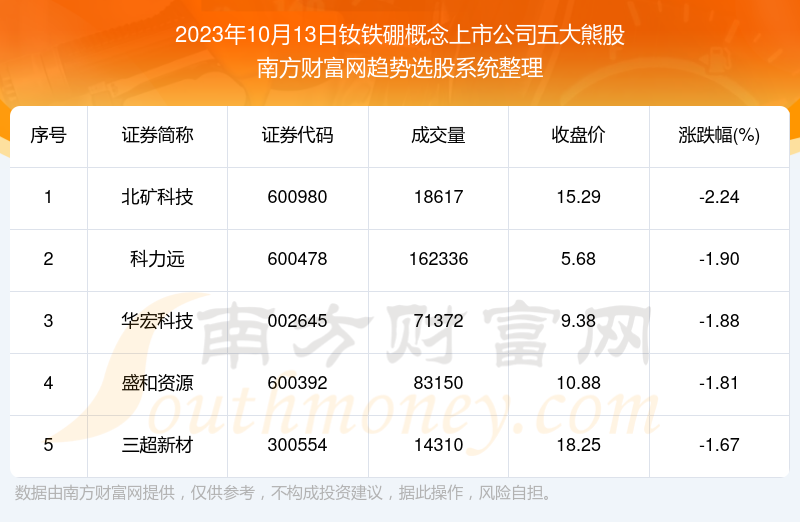 以上内容就是对【配资中心 数据解盘|2023年10月13日钕铁硼概念上市公司五大熊股一览】的解答,如果解决了您的问题欢迎把链接分享给朋友(https://www.youge168.com/mod_article-article_content-article_id-48466.html)