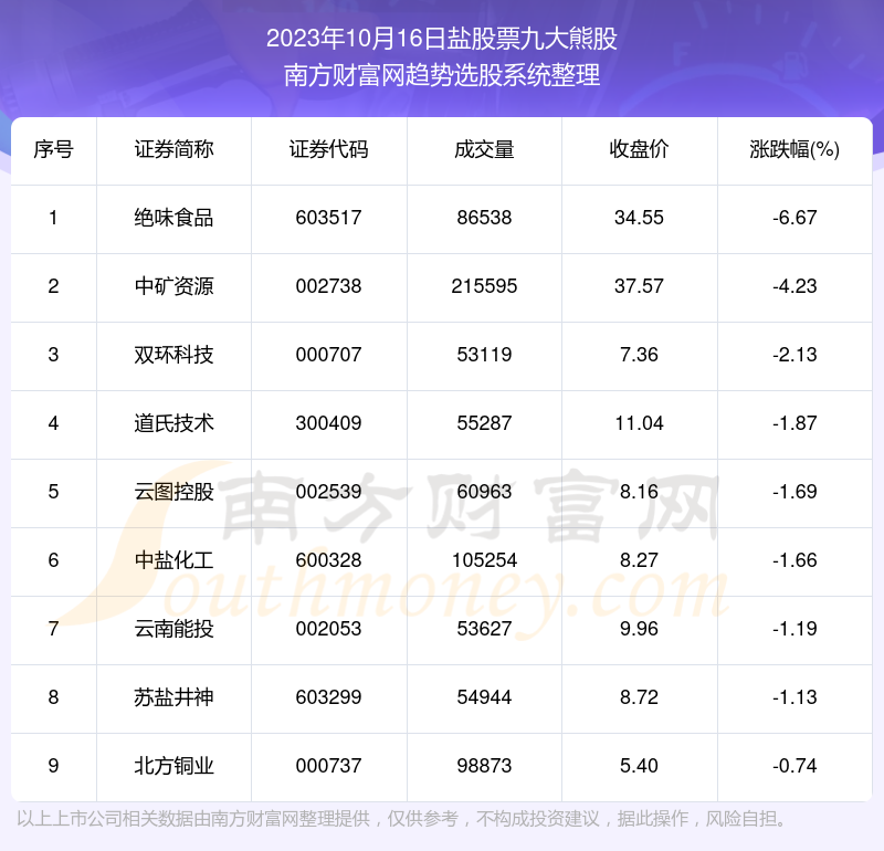 截止2023年10月16日,个股表现方面,盐股票当日领跌股为绝味食品(603517),该股当日报收34.55,上涨-6.67%,成交量8.65万。中矿资源(002738)以下跌-4.23%紧随其后,该股当日成交量21.56万。此外,双环科技(000707)、道氏技术(300409)、云图控股(002539)均进入当日盐股票熊股之列。