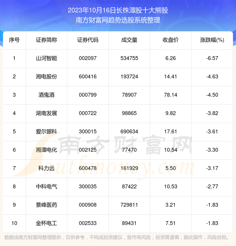 截止2023年10月16日,个股表现方面,长株潭股当日领跌股为山河智能(002097),该股当日报收6.26,上涨-6.57%,成交量53.48万。湘电股份(600416)以下跌-4.63%紧随其后,该股当日成交量19.37万。此外,酒鬼酒(000799)、湖南发展(000722)、爱尔眼科(300015)均进入当日长株潭股熊股之列。