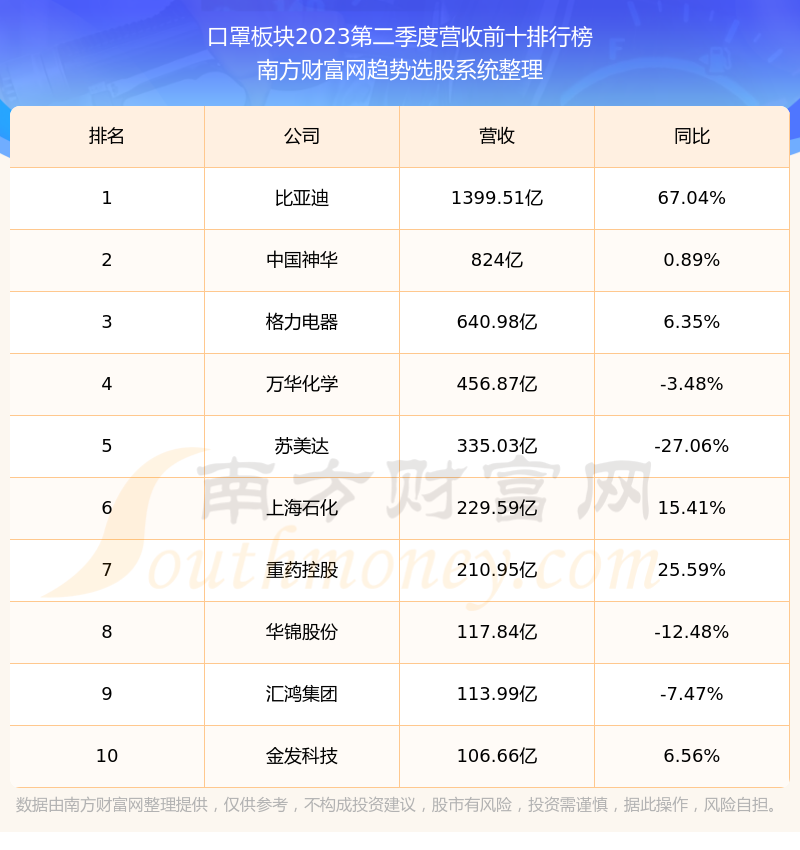 按照南方财富网趋势选股系统统计,该股所属板块为口罩板块,该板块共有218只股票,珍宝岛2023第二季度营收在该板块中排名为第79名,该板块2023第二季度营收排名前十的股票如下表: