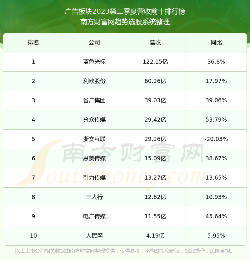 按照南方财富网趋势选股系统统计,该股所属板块为广告板块,该板块共有15只股票,博瑞传播2023第二季度营收在该板块中排名为第15名,该板块2023第二季度营收排名前十的股票如下表: