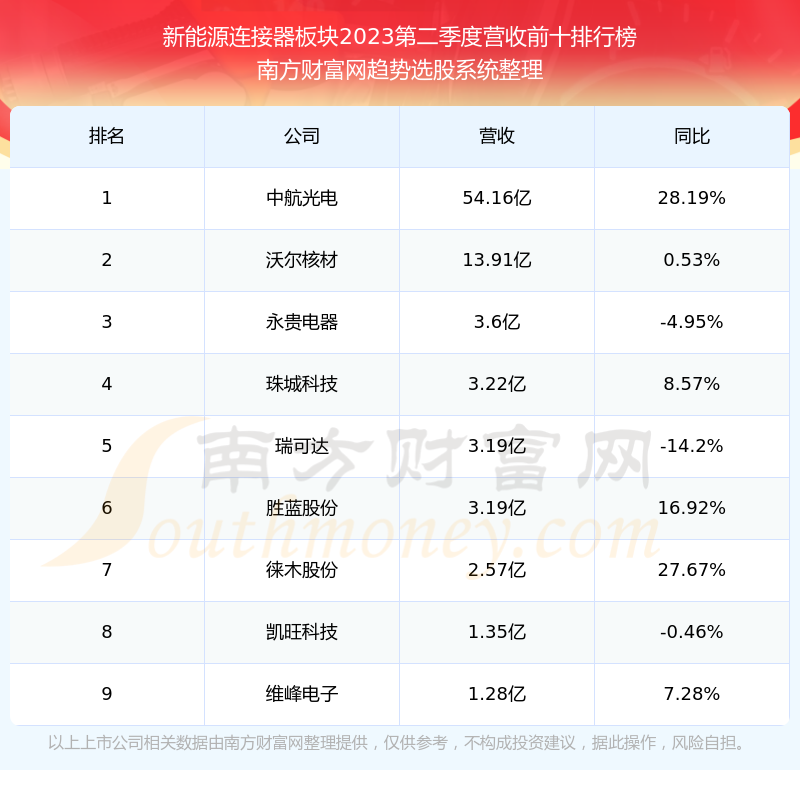 按照南方财富网趋势选股系统统计,该股所属板块为新能源连接器板块,该板块共有9只股票,瑞可达2023第二季度营收在该板块中排名为第5名,该板块2023第二季度营收排名前十的股票如下表: