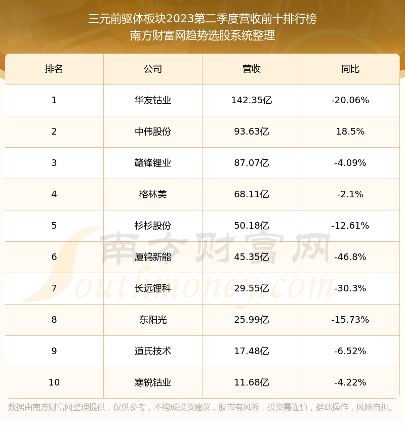 按照南方财富网趋势选股系统统计,该股所属板块为三元前驱体板块,该板块共有13只股票,芳源股份2023第二季度营收在该板块中排名为第13名,该板块2023第二季度营收排名前十的股票如下表: