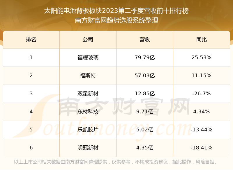 按照南方财富网趋势选股系统统计,该股所属板块为太阳能电池背板板块,该板块共有6只股票,航亚科技2023第二季度营收在该板块中排名为第6名,该板块2023第二季度营收排名前十的股票如下表: